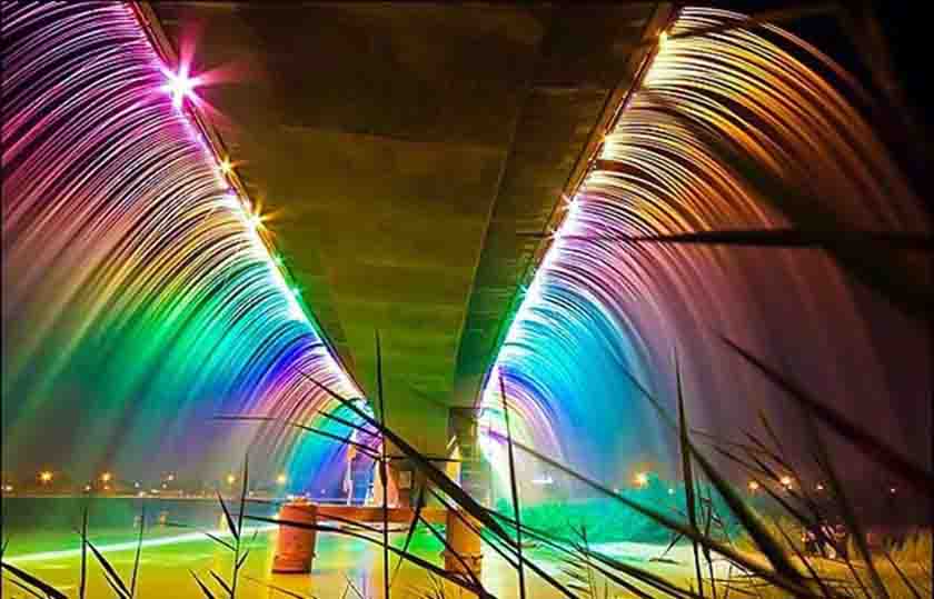 طولانی ترین و قشنگ ترین آبشار مصنوعی خاورمیانه در استان خوزستان و روی یک پل معروف در اهوازه جریان دارد. این آبشار مصنوعی، روی هفتمین پل اهواز که روی رودخانه کارون قرار دارد، ساخته شده تا مردم از دیدن این آبشار و عبور از روی این پل لذت ببرن. فواره ها از دو طرف پل داخل رودخانه می ریزن و شب ها با روشن شدن این فواره های رنگی، جلوه زیبایی به شب و پل داده میشه. بازی آب و نور باعث شده اهوازی ها، این پل را برای تفریح و گردش انتخاب کنن.